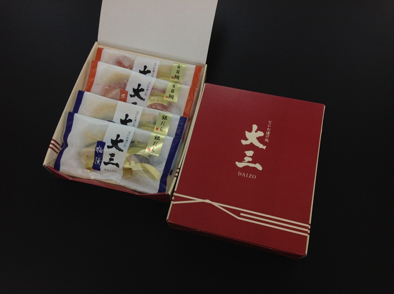 金と銀で華やかに、記念日等を演出・・・ なにわ漬け処大三の高級魚種の金目鯛西京漬けと銀だら粕漬けを各一切真空包装で詰合せしました。 ※こちらの商品は化粧箱に入れてお届けいたします。