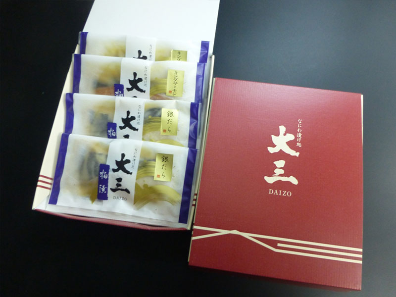 なにわ漬け処 大三の人気アイテム2種類(トラウトサーモン・銀だら)を粕漬けで各1切真空包装しました。 ※こちらの商品は化粧箱に入れてお届けいたします。