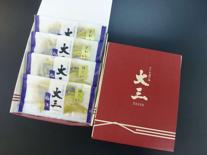 なにわ漬け処 大三の人気アイテム2種類(さわら・銀だら)を粕漬けで各1切真空包装しました。 ※こちらの商品は化粧箱に入れてお届けいたします。